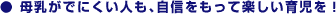 最近では人工ミルクの研究も進み、限りなく母乳に近い成分のものが多く発売されています。人工ミルクでも劣等感を感じることなく、堂々と不足分を哺乳びんで補いながら育児を楽しみましょう。楽しくない育児は本当の意味での育児ではありません。ただし、直接乳房を与える場合以上に心を込めて。 |