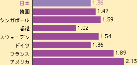 | いかがだろうか。この数字を高いと見るか、低いと見るか。ちなみに各国の経緯を上げると、ヨーロッパのスウェーデン、ドイツ、フランスの各国は、変動しながらもほぼ横ばい、僅かながら回復の傾向も見られる。シンガポール、韓国、香港は、3ポイントを超える高い水準から急激に落ち込んだ。特に香港の落ち込みは激しい。近年では、この3国は緩やかな減少に転じており、我が国の軌跡と同じ傾向にあるという。一方アメリカでは、1960年代から70年代にかけ1.8台まで急激に低下した後、90年代になって2ポイント台まで回復しており、現在でも回復傾向にあるという。アメリカを除き、数字にこそ差があるものの、先進国には全体的に少子化傾向がはっきり見てとれる。果たして少子化は進歩ゆえの副産物だろうか。 |