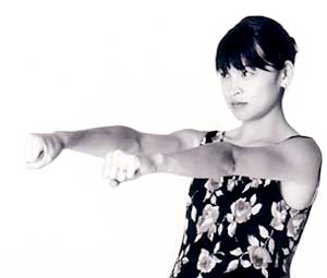 楽な姿勢で座ったら(立ってもOK)両手を組んで頭の上にのばしながら息をゆっくり吸い込みます。背筋が気持ちよく伸びたら一気に力を抜きましょう。数回繰り返したら今度は片腕ずつ耳の横まで手を挙げ、カラダの脇を伸ばします。この時、呼吸に合わせてリズミカルに動かすのがポイントです。
